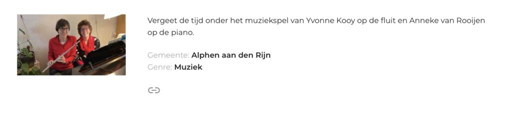 Sinds september 2015 zijn Yvonne Kooy (fluit) en ik (Anneke van Rooijen, piano) een muzikaal duo. Yvonne speelt in een symfonieorkest en speelt daarnaast graag stukken met piano. Ik heb ruime ervaring met samenspelen. We kennen elkaar van het tennispark en toen onze muzikale hobby ter sprake kwam was het een kleine stap om te gaan samenspelen. We hebben inmiddels een gevarieerd repertoire, waaruit wij recent tijdens het festival “Gluren bij de buren” in 2024 iets hebben laten horen.